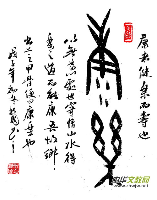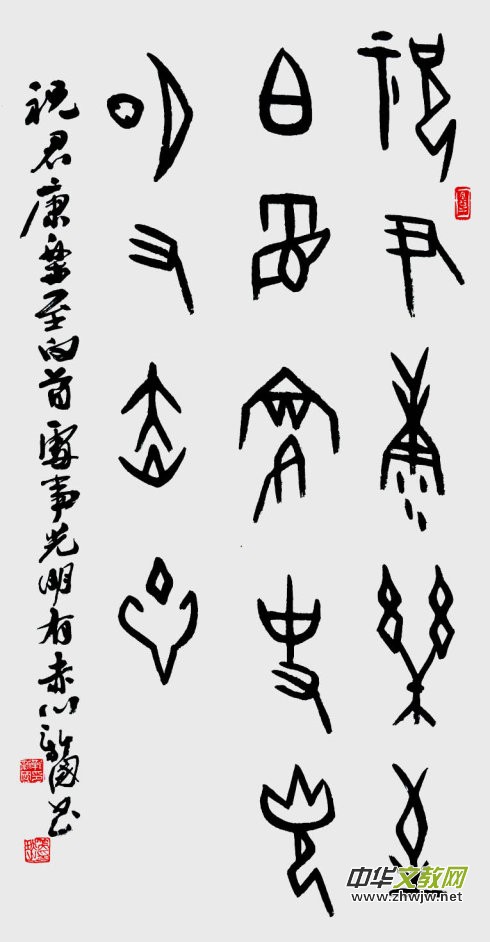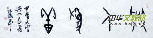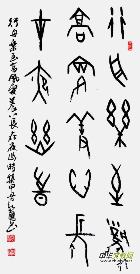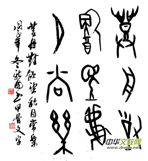 新國的甲骨文書法氣爽神邁,風(fēng)骨超然,他追求厚重灑脫的書風(fēng),使之線條優(yōu)美,又不失甲骨刀刻之意,作品常以古拙蒼渾和氣勢豪邁的筆鋒表現(xiàn),于遒勁挺拔中見秀銳,樸茂凝重之間顯生動(dòng)。