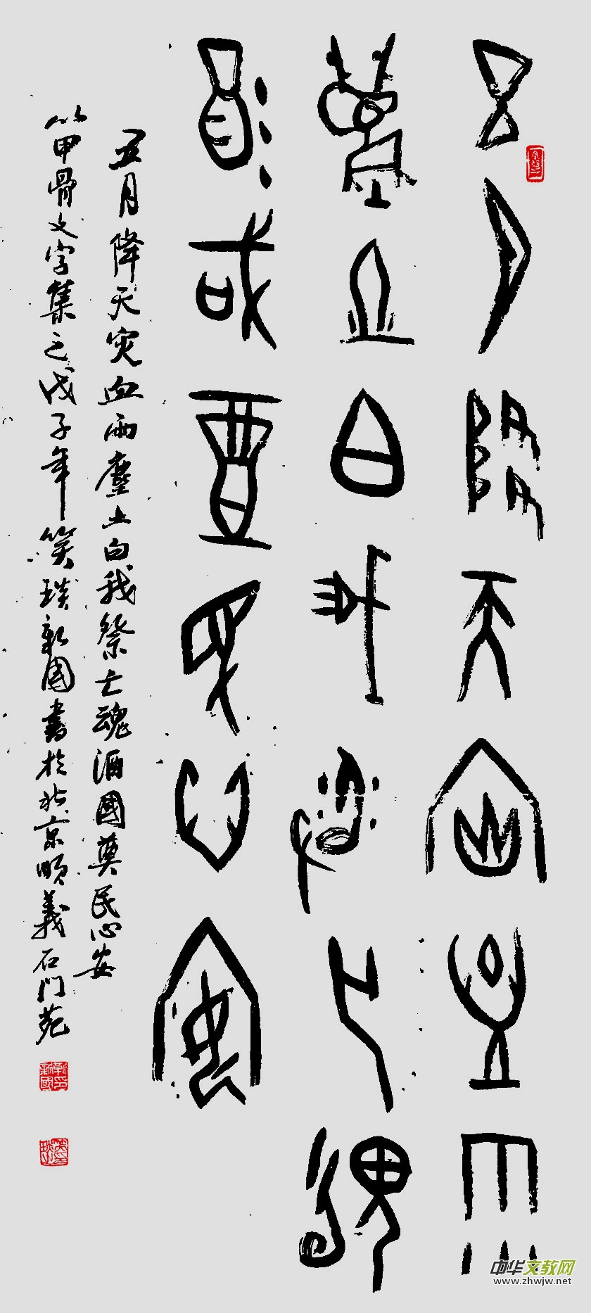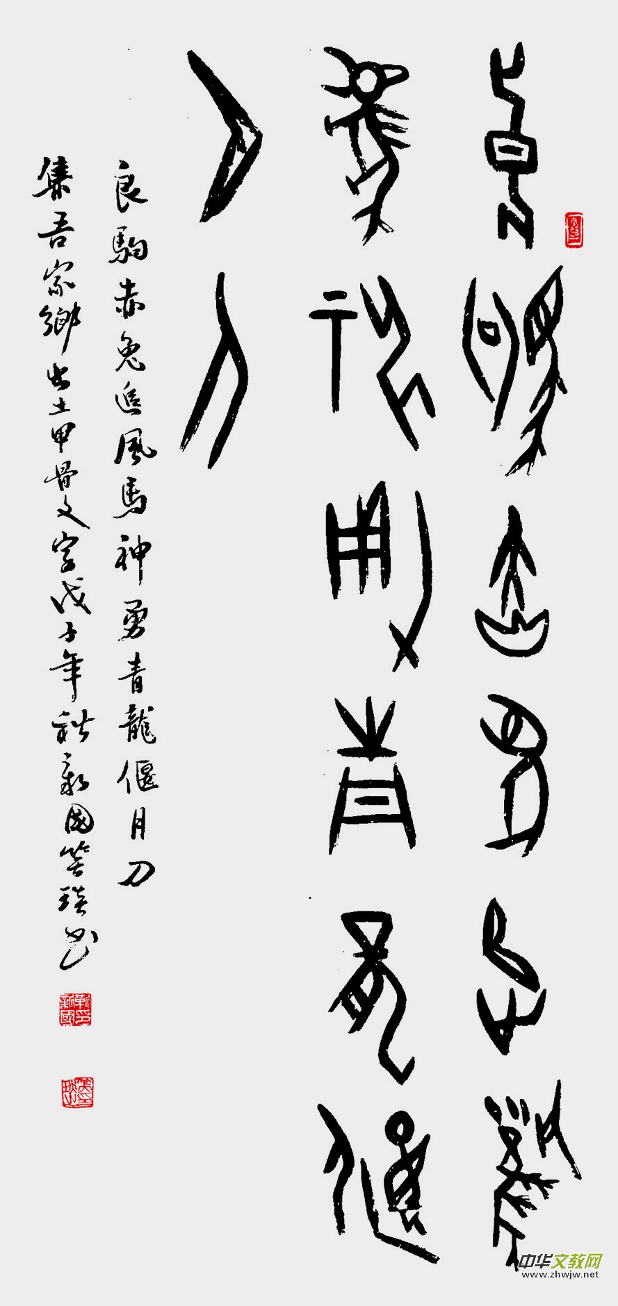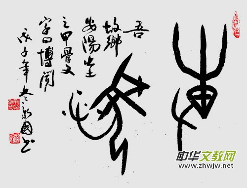 《作家報(bào)·藝術(shù)世界》主編、書法家楊紹穆先生曾在新國甲骨文個(gè)人書法展時(shí)賦詩一首:“安陽甲骨欲尋根,雨潤書法不同倫。點(diǎn)畫拙樸能膺古,抱殘守缺布局新。兼師南宮二王法,讀貼著述百家文。”