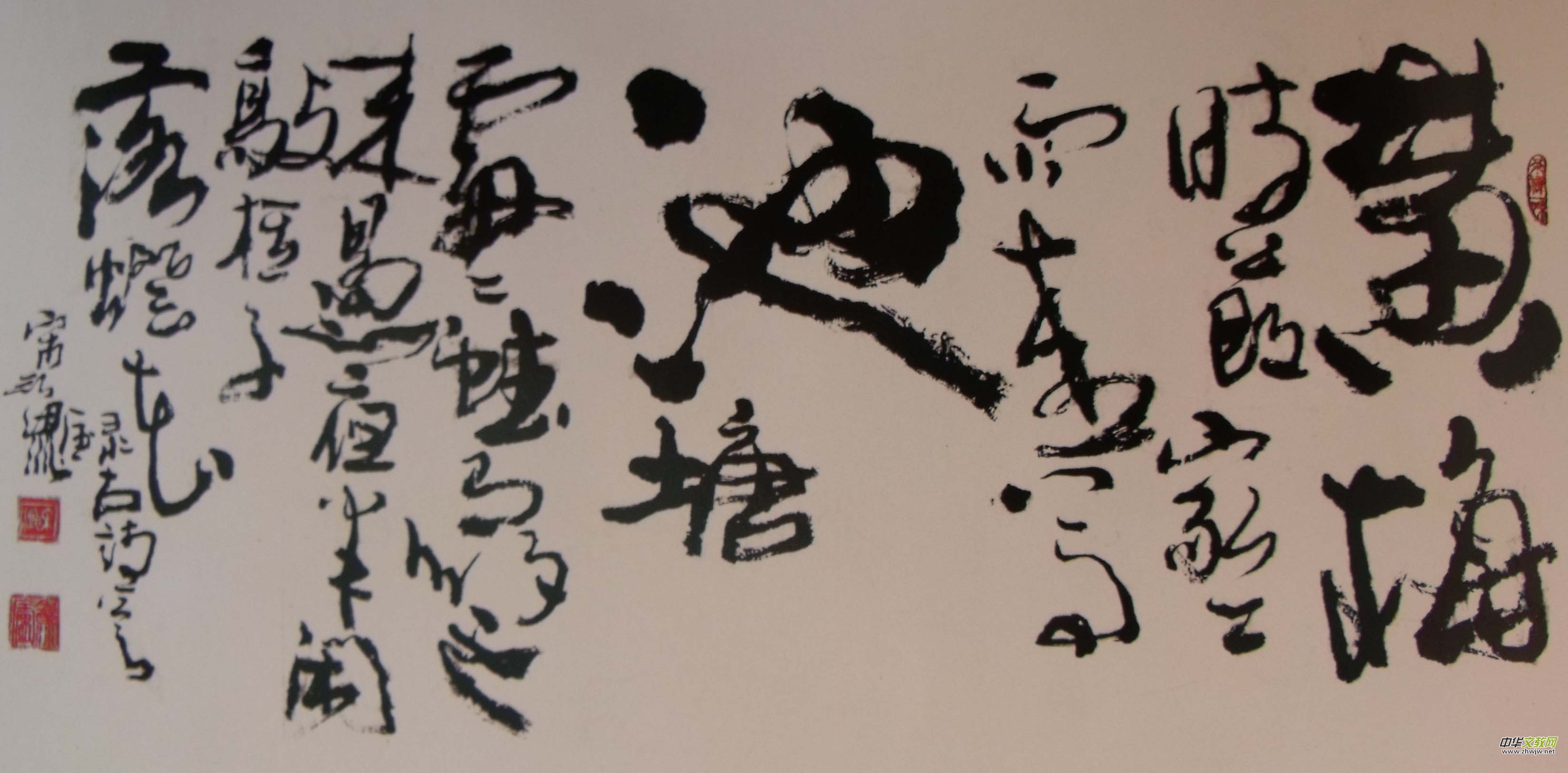 藝術(shù)是對這個世界最本質(zhì)抽象東西的一種形象的描述。宋漁先生認為書法是詩、是畫,是心靈的交響曲流淌出來的無聲的音符。書法抽象到了只有線條,所以想表現(xiàn)出某種東西是最難的。如何在線條的曲折、變化、連接、結(jié)構(gòu)、墨分五色中,在人們的腦海中變幻成詩一樣的圖畫?這無聲的音符在觀者的視覺中能不能轉(zhuǎn)化成有形的畫面?這是書法家要追求的。顯然在這方面宋漁先生是成功者,宋漁先生更認為書法是一種哲學,是歷史、文學、修養(yǎng)、眼界……的積累,屬于形象思維意識形態(tài)的領(lǐng)域,是靈魂深處的東西。所以他的作品才有更強大的震撼力,感染力和視覺沖擊力。書法是人類精神的心電圖。