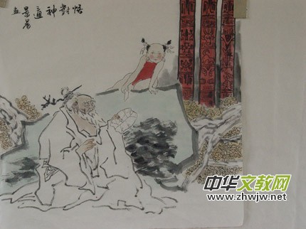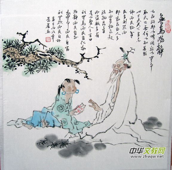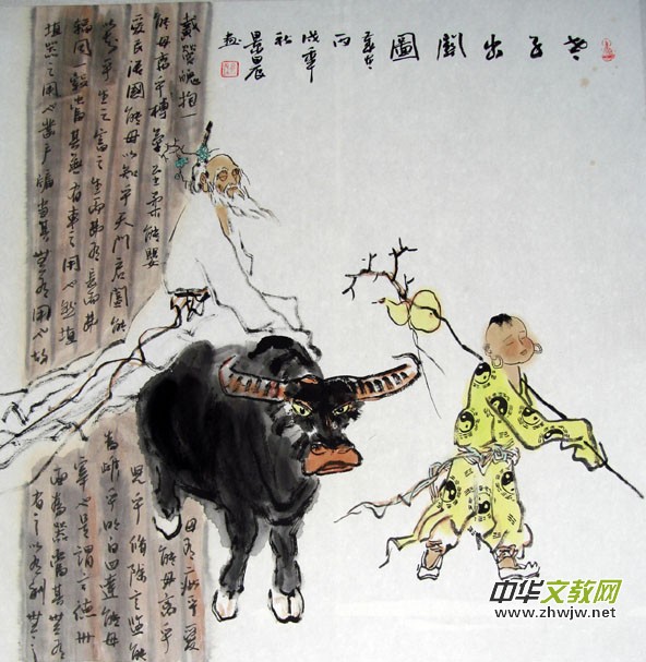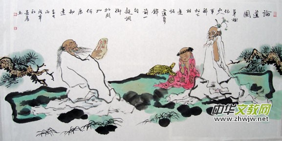 吳景晨人物畫(huà)中,表現(xiàn)出他對(duì)中國(guó)傳統(tǒng)人物繪畫(huà)的師承,對(duì)西方繪畫(huà)的融化,對(duì)現(xiàn)代構(gòu)成的運(yùn)用,因?yàn)樵趨蔷俺繉W(xué)畫(huà)的歷程中都不同時(shí)期、不同程度地對(duì)油畫(huà)和設(shè)計(jì)進(jìn)行過(guò)實(shí)驗(yàn),就這批佛、道博古幽深的作品中,我們聆聽(tīng)到,群山苦禪,品茶論道之高古今論,在借古人古語(yǔ)中,我們解讀到當(dāng)代人物畫(huà)的精神實(shí)質(zhì),無(wú)論在畫(huà)畫(huà)氣質(zhì)的營(yíng)造上,從造景造勢(shì),再由造勢(shì)到造情,聲勢(shì)浩蕩,氣韻貫通,編款布白,既白當(dāng)黑上,反映出吳景晨駕馭詩(shī)、書(shū)畫(huà),接博古,鑄當(dāng)代的才情和學(xué)養(yǎng)。《老子封侯》的寫(xiě)意,布白,設(shè)色與用線紅綠對(duì)照,干勾濕潤(rùn)、寫(xiě)染石的平和,以古典般橫臥,與被封的“侯”的假借,從形式上看,題字偏跋的錯(cuò)落與入木端莊的瘦金書(shū)的山巒起伏,形成空形與實(shí)形的對(duì)比,將博大、高古的‘厚德載物,得道多助’的理念以現(xiàn)代闡釋。《唯念手中龜》我們注意到吳景晨的大寫(xiě)意花鳥(niǎo)的蒼勁瀟灑的用筆,將石如松,松如石的盤(pán)龍般遒勁的張力,與老子在對(duì)視神龜時(shí)的寧?kù)o致遠(yuǎn),形成和諧中對(duì)比,畫(huà)面幾點(diǎn)重墨如老子座臥的身姿的三角形延伸,使石與人,人與石品格、形式相統(tǒng)一。而童兒發(fā)際的橫向強(qiáng)調(diào),與青石的輪廓勾勒,一張一弛,畫(huà)眼與思想情,借甲骨文的朱刻雋永與神壽金龜?shù)拈啔v世事,在唯美、潤(rùn)物的覺(jué)悟中,傳達(dá)一種超凡脫俗的文化內(nèi)涵。我們注意到,吳景晨把山水中的美學(xué)本體“道”,運(yùn)用于人物畫(huà)中,將大寫(xiě)意花鳥(niǎo)畫(huà)中的“逸”態(tài),注入人物畫(huà)的“勢(shì)”中,反映出吳景晨在文化內(nèi)涵上的一貫性和融會(huì)貫通。