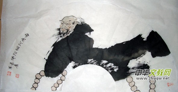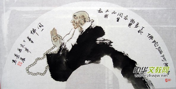 在《天地萬(wàn)物與我同生而又與我同佛》系列創(chuàng)作中,應(yīng)該說(shuō)這一批作品是景晨將書(shū)法的“人”字,破墨與簡(jiǎn)筆人物畫(huà),以一當(dāng)十,既白當(dāng)黑,畫(huà)的扇面形式,揉為一體,創(chuàng)造出了另一番大寫(xiě)意人物畫(huà)風(fēng)格的突破性嘗試,物我兩忘,象外之象,畫(huà)之韻,人物造像,用筆用色頗現(xiàn)老道而自信,佛之氣息與天地共呼吸,陶醉于淋漓酣暢的情境中,乍看為書(shū),二看為畫(huà),三品書(shū)畫(huà)文心交融,空白的極妙設(shè)置經(jīng)營(yíng),為讀者預(yù)留了極大的補(bǔ)充空間,為傳統(tǒng)精神當(dāng)代心性之寫(xiě)照。飄逸的佛珠與羅漢佛在視覺(jué)設(shè)計(jì)的多時(shí)空轉(zhuǎn)換,使畫(huà)面既有時(shí)間的延續(xù),也有四維,五維空間的音樂(lè)節(jié)奏變化,佛造像在字形,人字形的起筆藏鋒,抑揚(yáng)頓挫中,把書(shū)法的抽象美與國(guó)畫(huà)畫(huà)面的黑白灰相得益彰,其中佛手勢(shì)的力量和指向性,布下了一個(gè)行進(jìn)中的佛之流動(dòng)空間,現(xiàn)代藝術(shù)視知覺(jué)之虛形與實(shí)形,圖與底的關(guān)系,在此幅詮釋了中國(guó)話語(yǔ)。