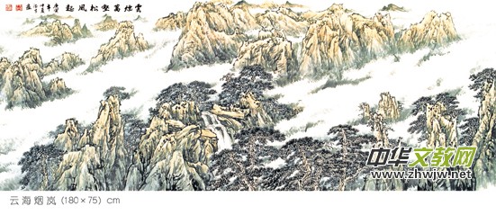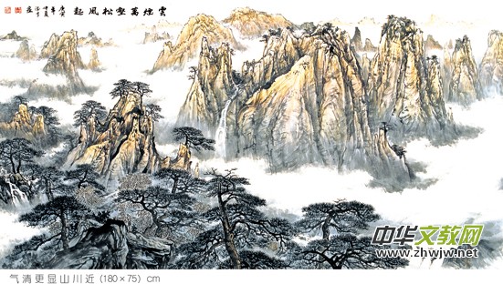 氣象萬千、多姿多彩的自然景色,一直以來是無數(shù)畫家們謳歌不盡的永恒主題。同為描繪山川草木,卻因其生活閱力和思維方式的不同,知識結(jié)構(gòu)和藝術(shù)修養(yǎng)的差異,使得作品的表現(xiàn)形式也風(fēng)格迥異,各具千秋。作為空軍的畫家,四十余年的軍旅生涯令他對藍(lán)天白云情有獨鐘。他曾不止一次地在飛機上近距離地觀察云海,厚厚的云層猶如深海涌浪般極具動感的奇特景象,令他心生豪邁,難以釋懷。一直以來他苦苦思索著通過什/厶樣的表現(xiàn)形式來抒發(fā)內(nèi)心深處對人民軍隊的熱愛,在此找到了答案。浩緲的宇宙,蔚藍(lán)的天際就是人民空軍守護的神圣領(lǐng)空,所以,他的作品多是以描繪祖國河山為主題,以浩瀚的云海為特色。《長城頌》、《云水之間》、《云濤萬里圖》等作品則生動地說明這一切。畫面中舒卷飛揚,靈動飄逸的云海令山巒層次厚重深遠(yuǎn),泉水含畜豐富,樹木蔥郁繁茂,彰顯著大自然的勃勃生機。那種大塊面,全景式的構(gòu)圖風(fēng)格,使作品呈現(xiàn)出一種山巒蒼茫,草木華滋的水墨氣象,猶如清風(fēng)拂面,令人耳目一新。