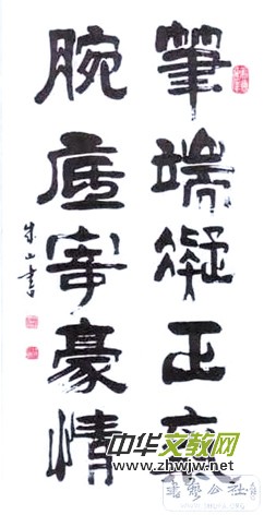 先生自幼酷愛書法,潛心研習(xí)顏、歐及二王之碑帖,在隸、篆方面下過較深功夫,但他師古而化,取百家之長為己用,把中國傳統(tǒng)書法各種書體的筆法融為一體,用筆上既有真、草、隸、篆帖學(xué)的流暢,又有碑學(xué)的生澀蒼勁的金石味,章法上虛實、濃淡、動靜、交錯有致,活而不亂,工而不板,大氣磅礡,變化多姿,渾然一體,確實就像著名書畫家李苦禪先生所講的“書到高時就是畫”。這種書體是成山先生多年來研究的結(jié)果,現(xiàn)已形成獨特的風(fēng)格———“變體隸書”。他的書法理論也有較深的造詣,編輯出版了《標(biāo)準(zhǔn)書法教材》《中等書法教程》 《硬筆書法教材》 《李成山書法藝術(shù)》等。書法作品在國際、國內(nèi)各級展賽中多次獲獎,作品多次應(yīng)邀在新加坡、美國、韓國、加拿大等國家及國內(nèi)的北京、香港、臺灣等地展出,曾多次作為威海市外事活動的饋贈禮品送往日本、東南亞等幾個國家和地區(qū)。傳略和作品幾次在省級電視臺、報紙刊出,收錄到《世界書畫銘錄》、《東方之子》書畫卷、《中國歷代書畫名家大辭典》、《世界名人錄》、《中華傳世名家系列專集》等,慶祝建國六十周年由文化部人才中心編輯、中央文獻(xiàn)出版社出版發(fā)行的《六十年六十家》書畫卷收錄了多幅作品。