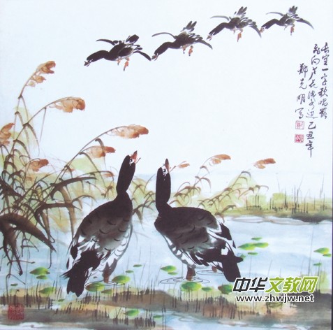 鄭克明先生自幼生長(zhǎng)在大雁棲息之地,少年起耳濡目染,在繼承清代畫家邊壽民畫蘆雁之法的同時(shí),將沒(méi)骨法及書法用筆融人自己的作品加以創(chuàng)新,既尊重傳統(tǒng)又師造化,使筆下的大雁栩栩如生、獨(dú)運(yùn)匠心,在技法和立意上都大大前進(jìn)了一步。其作品經(jīng)常參加各種畫展并被人民大會(huì)堂、中南海、毛主席紀(jì)念堂、革命軍事博物館、中國(guó)民族文化宮等重要機(jī)構(gòu)收藏。