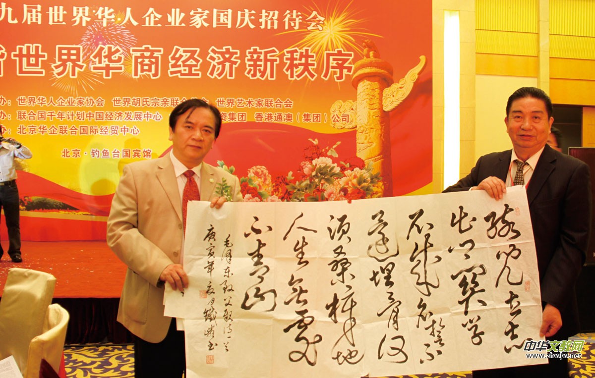 2010年第九屆世界華人企業(yè)家國慶招待會(huì)于9月27~29日在北京釣魚臺(tái)國賓館隆重舉行,國家領(lǐng)導(dǎo)人,國家相關(guān)部委負(fù)責(zé)人及社會(huì)各界知名人士出席了本次會(huì)議,大會(huì)授予了 “2010年度十大優(yōu)秀華人企業(yè)家”、世界著名藝術(shù)家”、“世界書畫藝術(shù)家”等。應(yīng)大會(huì)的強(qiáng)烈邀請(qǐng),來自廣東汕頭的中國著名書法家劉延超展示了其最近創(chuàng)作的作品,其剛剛出版的書法集《中國實(shí)力派書法家--劉延超作品集》也借此機(jī)會(huì)隆重首發(fā),該作品集是由著名書法家、詩人、資深傳媒人笑琰先生題寫書名,并經(jīng)cctv和科技信息報(bào)今日文教編輯部推薦的最具收藏價(jià)值書畫名家集,收集了作者近年的力作。鑒于劉延超在書法藝術(shù)的卓越貢獻(xiàn)和高深藝術(shù)造詣經(jīng)大會(huì)組委會(huì)的一致認(rèn)可,并成功入選大會(huì)以上榮譽(yù)。