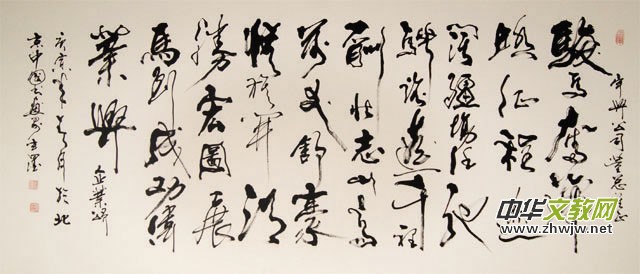 韓治文先生不少行草書(shū)作伴隨著激烈深厚的感情一并流出,大氣包舉,有如萬(wàn)里風(fēng)潮卷地而來(lái),突兀而去,抒豪情,寄壯志,縱橫交織,淋漓盡致,英氣可鞠,正氣凜然,顯露出執(zhí)著忠貞的品格,為人所贊賞。