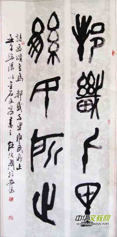 中國(guó)書法源遠(yuǎn)流長(zhǎng),博大精深,內(nèi)涵豐富,情趣無(wú)窮,作為岳武穆桑梓學(xué)子,任治國(guó)受岳飛愛國(guó)主義思想的影響,對(duì)其書法更是愛不釋手,著意于《前后出師表》的筆意,以求行墨飛揚(yáng),神完氣足,故青年時(shí)代書法即以俊美瀟灑風(fēng)格,聞名鄉(xiāng)里。迨及壯年,潛心研習(xí)顏魯公之楷,董其昌之行,尤重二王、米芾諸家。80年代后,鐘情趙之謙,并基于北碑風(fēng)貌,取篆隸筆意,把各家精華融為一體,巧妙揉合,以“行”為體,古樸奇拙,格外高雅,筆勢(shì)險(xiǎn)勁,氣魄宏大,結(jié)體多變,章法嚴(yán)謹(jǐn),時(shí)出新意,優(yōu)美飄逸,極富動(dòng)感;黑白之間,跳躍起伏,蒼茫壯闊。近年用心探索甲骨文書藝及現(xiàn)代書法的表現(xiàn)技法,并將音樂的節(jié)奏與旋律,國(guó)畫的構(gòu)圖與神韻,武術(shù)的風(fēng)姿與內(nèi)蘊(yùn),氣功的功理與功法,融于書法創(chuàng)作,別具新意。所書甲骨文書法,風(fēng)格古雅遒勁,清新雋俊,流暢多變,疏密有致,隨心所欲,揮灑成章,且甲骨文少字?jǐn)?shù)書法,更具魅力,觀之如出水芙蓉,閉月羞花,散發(fā)著婉麗清逸之氣,在書壇獨(dú)樹一幟。書法作品經(jīng)常參與國(guó)內(nèi)外大展,也遠(yuǎn)流日本、韓國(guó)、新加坡、美國(guó)、加拿大、東南亞等國(guó)家及港、澳、臺(tái)等地區(qū)。許多作品被國(guó)內(nèi)外友人和單位收藏及在建筑上、商業(yè)上應(yīng)用。
