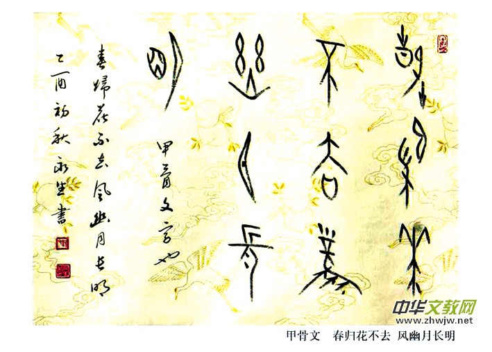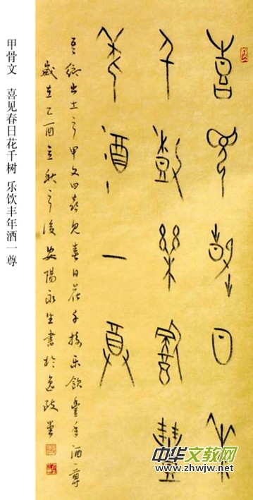 這些豐厚的文化遺產(chǎn)無疑是對(duì)安陽(yáng)人民最好的恩賜,比起外地是人無我有,人有我優(yōu),我們應(yīng)該更懂得加以保護(hù)和利用。郭永生沒有辜負(fù)了蒼天的厚愛,在這座知識(shí)的地下寶庫(kù)殿堂里,如饑似渴的吸收其中的精典文化,他的甲骨文書法不僅造詣深、功力厚,而且傳統(tǒng)文化知識(shí)底蘊(yùn)也深厚。在宏揚(yáng)甲骨文書法的同時(shí),經(jīng)常被邀請(qǐng)到各地訪問交流,他充分利用每次難得的機(jī)會(huì),將一幅幅甲骨文書法也留在了此地,讓大家不僅看到四大古文字之一---甲骨文,并且通過甲骨文了解到遠(yuǎn)古時(shí)期那段輝煌的歷史。