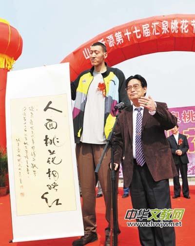 和世界最高的籃球運(yùn)動(dòng)員孫明明一起在沂源桃花島贈(zèng)送“人面桃花相映紅”