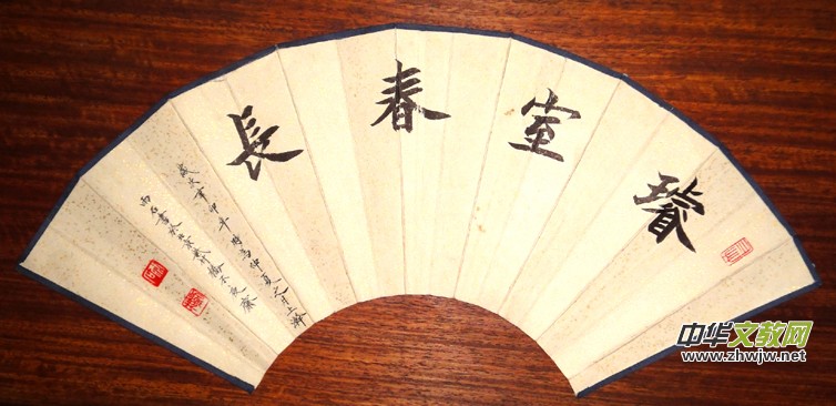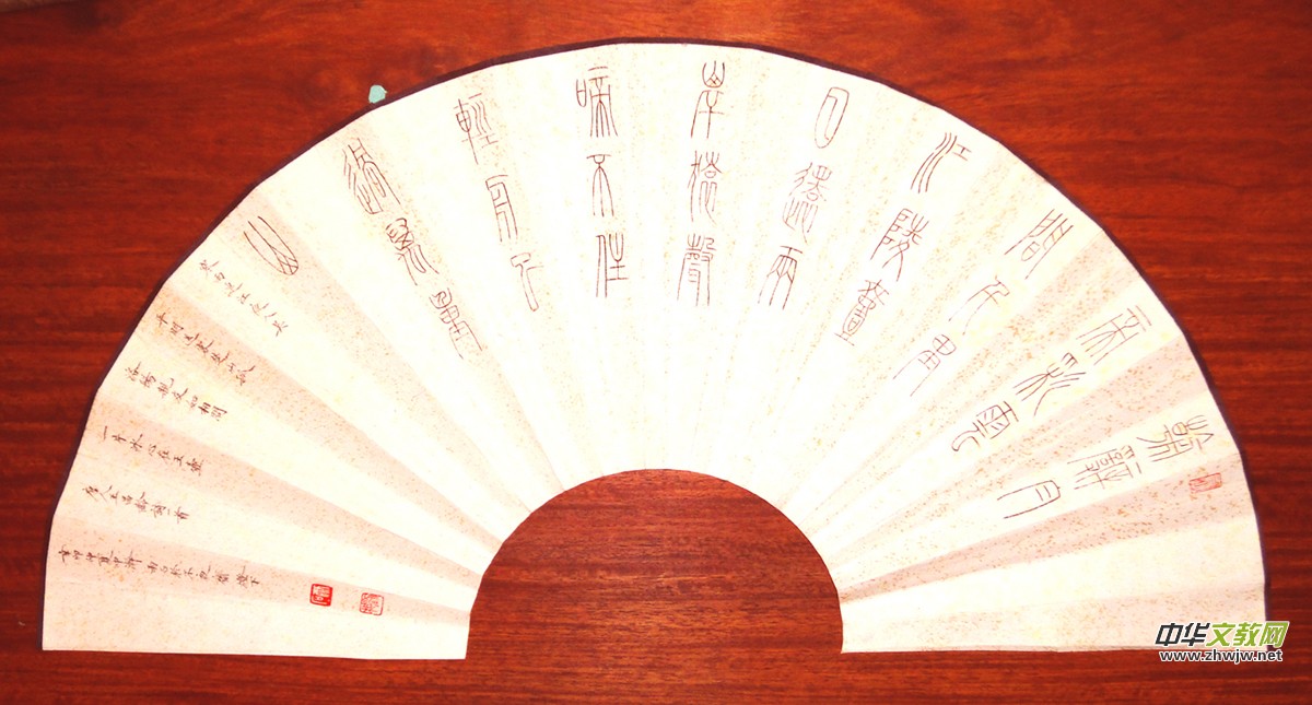 我經(jīng)過(guò)多年的藝術(shù)實(shí)踐,總結(jié)出的扇面書(shū)寫(xiě)的幾種主要形式有:一是長(zhǎng)短錯(cuò)落式(即一行長(zhǎng)、一行短)給人以強(qiáng)烈的錯(cuò)落美,適合于行草書(shū);二是行行字?jǐn)?shù)相等式,適合于隸書(shū)、楷書(shū)、篆書(shū)的書(shū)寫(xiě);三是一字成行式,這種形式適合寫(xiě)大字,書(shū)體不限,沿著折扇弧邊書(shū)寫(xiě),有意留出一片空白,具有空靈感。由于扇面高低不平,往往會(huì)給書(shū)寫(xiě)帶來(lái)很大的困難,需要精心設(shè)計(jì),苦心經(jīng)營(yíng)和反復(fù)實(shí)踐。