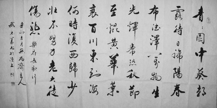 忠義兄姓武,號(hào)無(wú)為齋主人,生于1959年,河北磁縣人,是上世紀(jì)70年代末國(guó)家恢復(fù)高考以來(lái),考入大學(xué)的第一批學(xué)子。參加工作幾十年來(lái),先后經(jīng)過(guò)商、從過(guò)政。每每遇事,審時(shí)度勢(shì),不為俗禮所構(gòu)囿。環(huán)顧海內(nèi),運(yùn)籌帷幄,未雨綢繆,縱橫捭闔,有一種“匹夫之有重于社稷”的豪邁氣概。勤政為民,雷厲風(fēng)行,披荊斬棘,造福百姓。退休幾年來(lái),整日與筆墨共舞。在筆情墨趣中,安恬愉快,以明朗樂(lè)觀的思想情操吟詩(shī)作賦,在悠揚(yáng)的每一天中寄托深情,創(chuàng)作了不少高華雄渾之作,真是“照之有余輝,攬之不盈手。”翻古為新,道出長(zhǎng)路漫漫人生無(wú)限美好的情思,有如琵琶弦上的淙淙清音,氣象至為雍雅,頗得敦厚之旨。