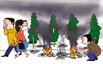 他的漫畫藝術(shù)表現(xiàn)手法常常借用中國(guó)古代文學(xué)中的格言、寓言和成語(yǔ)故事來(lái)表現(xiàn)當(dāng)前的社會(huì)突出問(wèn)題,漫畫造型極其生動(dòng),夸張而不失準(zhǔn)確,能夠迅速抓住某一新聞事件,用恰當(dāng)?shù)氖址ó嫵鰣?bào)道性或評(píng)論性的漫畫,及時(shí)刊載在新華社等報(bào)刊上。不少漫畫作品發(fā)表后,啟迪了千千萬(wàn)萬(wàn)的讀者。使他們理解,激發(fā)情思,發(fā)出笑聲,陶冶情操。有的作品更是被讀者小心翼翼地從報(bào)紙上剪下,收藏起來(lái)。就讓我們來(lái)欣賞他的一幅漫畫作品《清明節(jié)時(shí)“煙紛紛”》吧!作品內(nèi)容反映當(dāng)前社會(huì)的一個(gè)陋習(xí),每到清明節(jié)這天,是悼念逝去親人的節(jié)日,大家都要到墳前祭拜親人,自然少不了燒紙。但是,由于現(xiàn)在很多人工作比較忙,不能趕回老家祭拜親人,又不能少了這一道理,不少人常常在十字路口、大街主要干道兩旁燒紙祭奠親人。結(jié)果弄得到處是煙霧繚繞,嗆得過(guò)往行人不能行。不僅造成了污染,還破壞了環(huán)境,十分不可取。這幅漫畫作品主題深刻,刻畫精細(xì)。就是提醒大家一定要珍惜環(huán)境,愛(ài)護(hù)我們的家園。讓讀者能夠刻骨銘心,永記心頭,不要再犯。