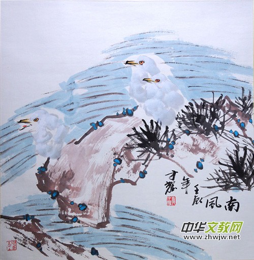 黃才耀畫(huà)竹也見(jiàn)功力。落墨大膽,點(diǎn)節(jié)布葉機(jī)巧。讀畫(huà)其實(shí)就是和藝術(shù)家內(nèi)心深處的交流。在《湘江暮雨寒》中,浸泡于雨季的墨竹,在傍暮歇晴的一刻,一只心懷怯意的小鳥(niǎo)便來(lái)訪問(wèn)它了。物象照應(yīng),正好透露了藝術(shù)家對(duì)客觀世界的傾注關(guān)聯(lián)。