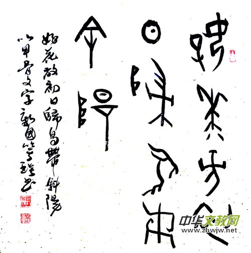 《作家報·藝術(shù)世界》主編、書法家楊紹穆先生曾在新國甲骨文個人書法展時賦詩一首:“安陽甲骨欲尋根,雨潤書法不同倫。點畫拙樸能膺古,抱殘守缺布局新。兼師南宮二王法,讀貼著述百家文。”