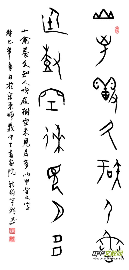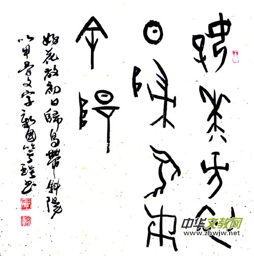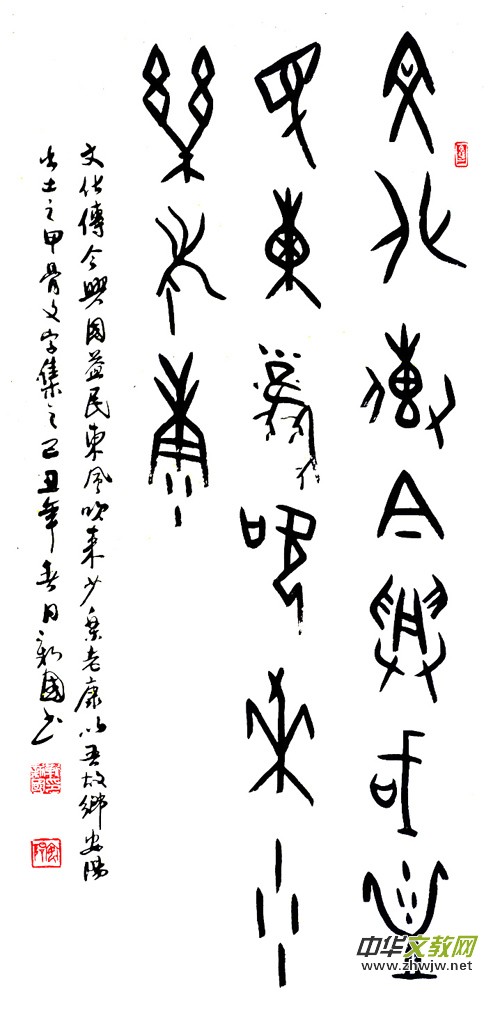 《作家報·藝術世界》主編、書法家楊紹穆先生曾在新國甲骨文個人書法展時賦詩一首:“安陽甲骨欲尋根,雨潤書法不同倫。點畫拙樸能膺古,抱殘守缺布局新。兼師南宮二王法,讀貼著述百家文。”