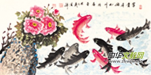 楊順鋒先生畫魚,還有一個(gè)顯著的特點(diǎn),就是重視生動(dòng)的背景,使作品富有藝術(shù)生命力,在強(qiáng)烈的背景襯托中求和諧。游魚背景取牡丹、荷花、蘆薈的等花草,這種小寫意花卉既有一定真實(shí)感,又表現(xiàn)出相當(dāng)筆墨技巧和高超的組織能力。他也重視色彩的裝飾性,筆隨心走,彩由情敷,生機(jī)盎然,意氣風(fēng)發(fā),熱情奔放,物我一體的感悟和胸臆。也是畫家的天賦、秉性、自由取向的表白,面對(duì)自然中的生靈,面對(duì)著造化的意境,畫家不禁心里一念,一念而生,動(dòng)為求心里的一方凈土,而凈土的妙樂源于施人的隨緣。常言道:“工細(xì)之中見精微,傳神之處見精神”就是這個(gè)道理。他的作品不僅為了市場(chǎng)的需求,其學(xué)術(shù)性價(jià)值也不容忽視,在用色,用墨、用水等繪畫語言上的探索和畫面的空間處理上都別有新意,與眾不同,形成獨(dú)特風(fēng)格。