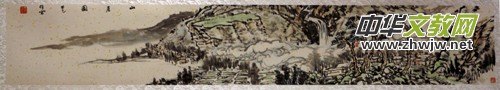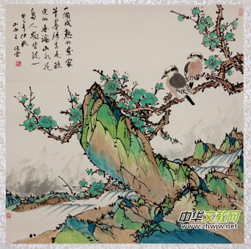 其山水走的是青綠一路。青綠為質(zhì),金碧為紋,工整細致,綺麗紛繁。青綠山水宜于鋪排靡麗、奢華堂皇之表現(xiàn),其作也以春光和煦、山野清新、巨崖險峻、云嵐環(huán)繞構(gòu)圖為素常,開合有度,虛實相生,乃生生之德,陽剛之美也。其審美情趣在于歸隱山林,親近泉源,澄懷觀道,靜以求之。色重筆工的青綠山水又極易流于匠氣、俗氣、火氣,極易被程式化地纖細孱弱。其作畫貌似古,而實質(zhì)有新,青綠敷染后,墨筆復(fù)寫,由淡入濃,由潤而枯,設(shè)色雖淺淡而能深沉,艷麗而能清雅,濃烈而能古厚。筆墨所致,蒼勁醇然,雋秀華滋,意境更是幽幽縹緲,恬靜空靈,可謂精工之構(gòu),又有士氣。