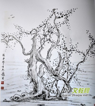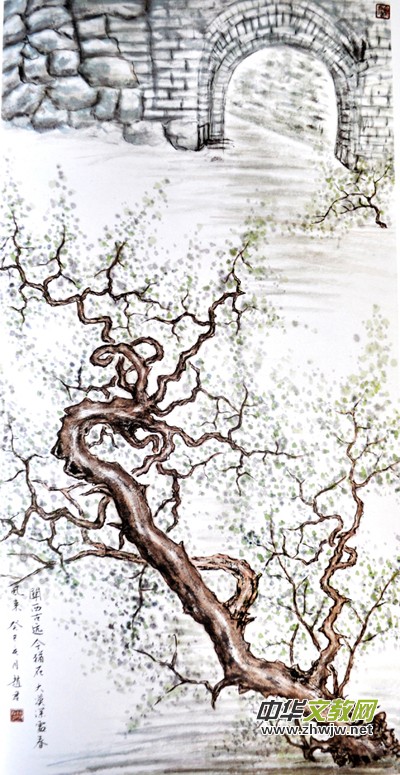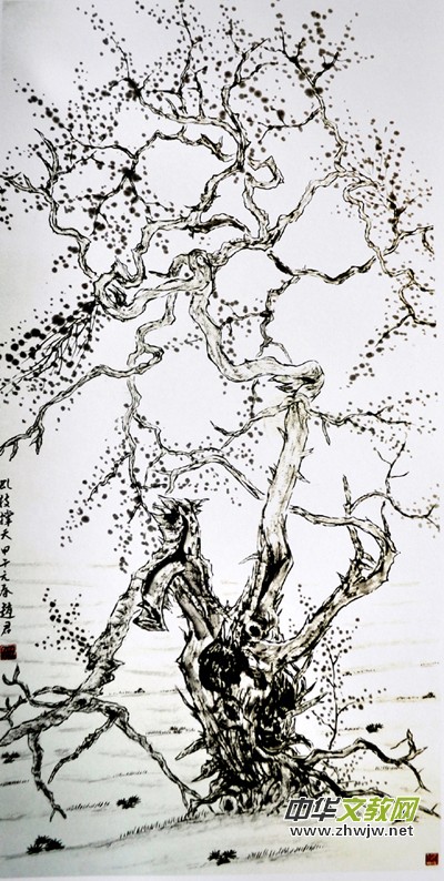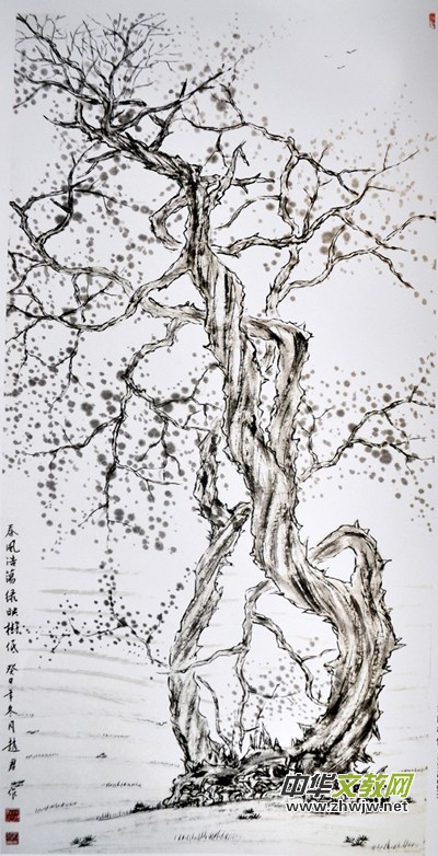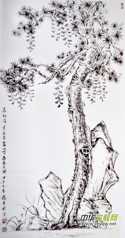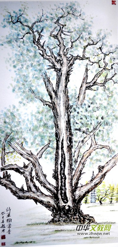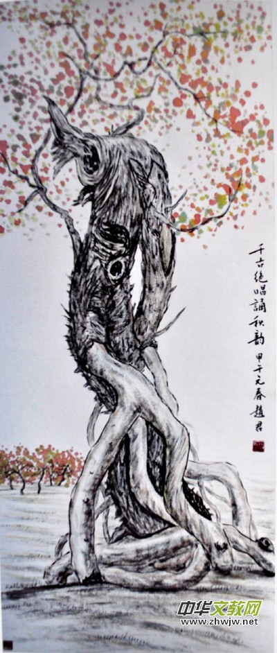 趙君先生熱愛生活,提倡保護自然,對破壞自然,砍伐森林給人類造成的后果,深表憂慮。為此趙君先生認真考察祖國各地的老樹、古樹樹生長的情況,經(jīng)過現(xiàn)場寫生取景得到大量素材,先后刻畫了兩卷近50米的百樹圖,表現(xiàn)了古樹、老樹、枯樹、殘樹的真實情況,借此喚醒人們對自然的關(guān)注。
