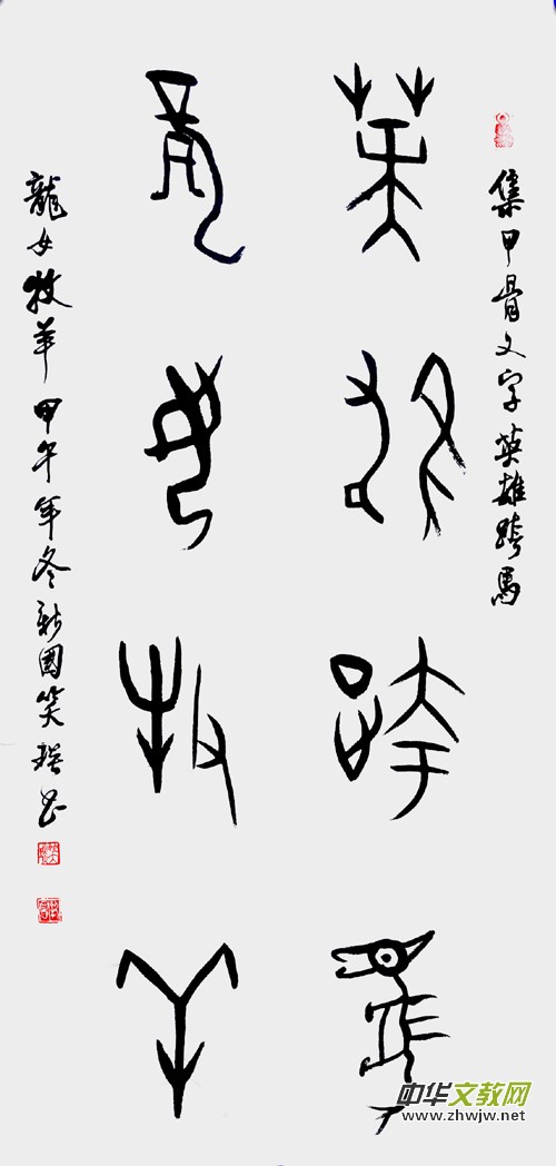 一、以形寫神。此作品氣勢(shì)飽滿,點(diǎn)畫之間勻凈利落,不緊密收斂,也不飄逸伸展,疏與密把握得很有分寸,符合人的視覺松緊感應(yīng)。書法系平面造型藝術(shù),改變點(diǎn)畫結(jié)體之形態(tài),即能營(yíng)造出不同的書體作品來。每個(gè)人都在寫字,但不見得所寫文字都能成為書法,只有按照書體的規(guī)律與準(zhǔn)則,將“形”寓于性情之中,以情寫形,以形達(dá)神,才能談得上書法。笑琰的甲骨文書法中,各字都有不同的相互呼應(yīng)之姿,在處理左右部首或偏旁關(guān)系時(shí),取巧挪讓,變化微妙,采用欲占先避、以險(xiǎn)安平、以動(dòng)制靜的手法。如“鳥”字,用不同形態(tài)的筆畫,不露聲色地刻畫出一個(gè)活靈活現(xiàn)的“鳥”字,相當(dāng)含蓄,顯示了欲露故隱的哲理,亦是常言所云“不見形似,只見神采”的最好詮釋。