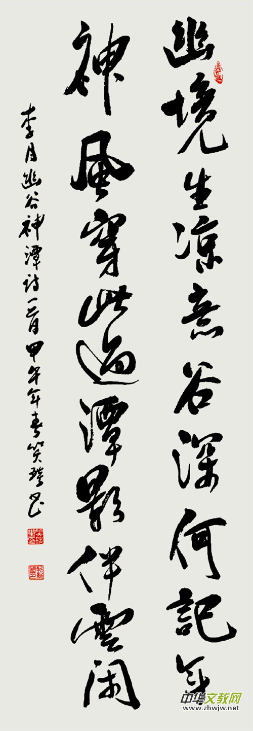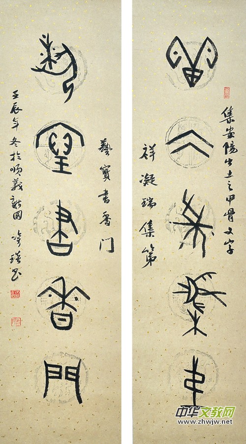 三、以法生意。前面說過笑琰的甲骨文書法以神入法,此外,又以法生意。這是高層次、高品位的作品所特有的一種大循環(huán)。書法藝術(shù)是形學(xué),然而更是意學(xué)。形學(xué)講究 “實(shí)”,旨在形式美,意學(xué)講究“虛”,旨在意境美,兩者的結(jié)合,組成了一種審美風(fēng)格。有法無意或有意無法都會(huì)走入歧途。不難看出,笑琰很注重這一點(diǎn),作品中洋溢著一種意趣,那就是拙厚與獷辣、奔放與含蓄、端莊與靈動(dòng)有機(jī)地結(jié)合在一起。點(diǎn)畫的方圓、輕重、疾澀血脈貫通,使其作品的字勢(shì)、筆勢(shì)、氣勢(shì)產(chǎn)生了不可言狀的意趣。在每個(gè)字的具象中,他強(qiáng)調(diào)了意的表述力。例如‘花“字,其向背開合,上展下縮,以縱取勢(shì),左右停勻?qū)ΨQ,以側(cè)映斜,使之產(chǎn)生一種音律與節(jié)奏意趣。這件甲骨文書作雄氣勃勃,潤(rùn)含春雨,饒有金石味。