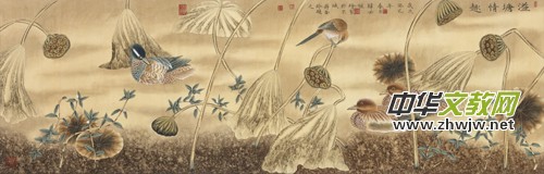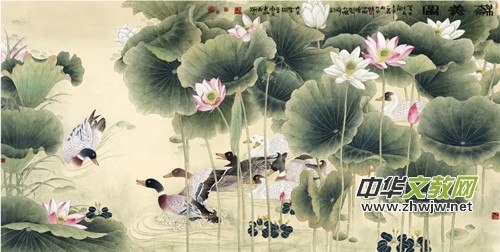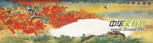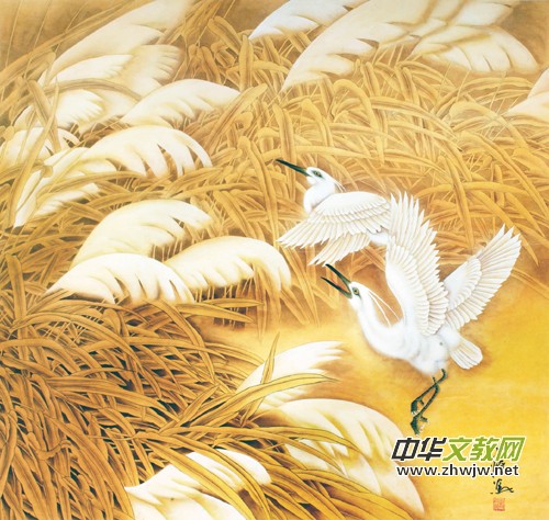 人民大會堂懸掛一副巨幅《圣禽圖》,就是出自于畫家韓必恒之筆,此畫布置相當巧妙,空間上透視感強,這需要作者獨出心裁,巧妙安排。雖然畫中所擷取的都是自然寫實的物象,但由于物象意念安排得巧妙和獨特,從而暗示出超出有限時空意象的無限理想化的藝術(shù)世界。