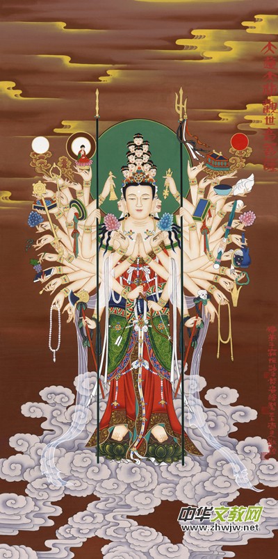 韓必恒的佛畫藝術(shù),可以說(shuō)圓融地體現(xiàn)了佛菩薩的智慧與慈悲。他將自己對(duì)佛教深切真實(shí)的體悟融入每一件作品之中,用中國(guó)畫的寫意、工筆畫的細(xì)膩和西洋畫的透視、寫實(shí)融為一體的技法,虔敬地去繪制每一幅清凈莊嚴(yán)、慈悲無(wú)我的佛畫。其佛像繪畫既如法如律,形神兼?zhèn)洌值缊?chǎng)清凈,法相莊嚴(yán),不僅贏得了佛教信眾的歡喜贊嘆,也受到諸多海內(nèi)外藝術(shù)大師的贊譽(yù)嘉勉。