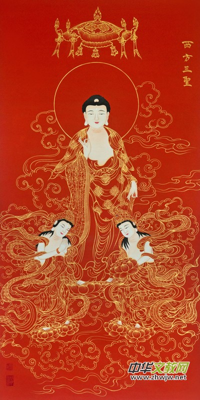 在中國(guó)歷代古窯、殿壁和經(jīng)卷上的諸佛菩薩繪畫造像,能夠讓我們今天有緣瞻仰的人,心生敬信,從內(nèi)心感受到佛陀的慈悲和智慧,甚至?xí)惺艿椒鹆Φ募颖弧7鸾汤L畫給人的這種猶如諸佛菩薩現(xiàn)前的覺(jué)受和感動(dòng),是難以用“藝術(shù)”一詞來(lái)詮釋的。如果說(shuō)通常的藝術(shù)匠心,祗是為了傳達(dá)藝術(shù)家創(chuàng)作的熱情與個(gè)人獨(dú)特的靈境,那么優(yōu)秀的佛教繪畫藝術(shù)則恰恰揚(yáng)棄了這些凡塵的意境。如果說(shuō)士大夫繪畫重在一個(gè)“意”字,文人繪畫重在一個(gè)“情”字,那么佛教繪畫就重在一個(gè)“凈”字。佛教中“凈”的境界,具足了真、善、美,契合了諸佛菩薩的廣大慈悲和無(wú)邊功德,因此人們才能從佛教繪畫藝術(shù)中體會(huì)到特殊的清凈與莊嚴(yán)。
