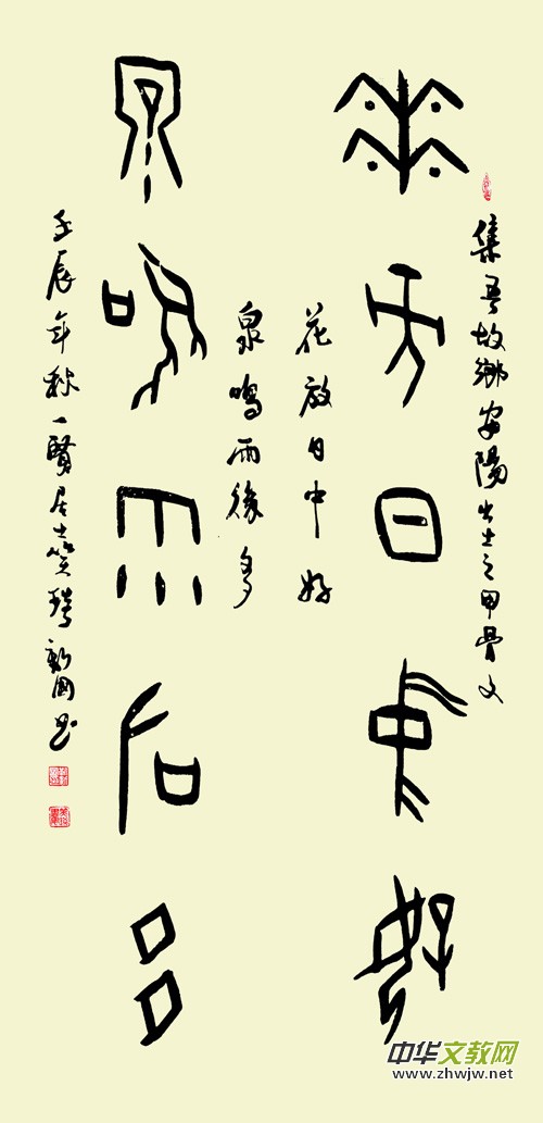 三、以法生意。前面說(shuō)過(guò)笑琰的甲骨文書(shū)法以神入法,此外,又以法生意。這是高層次、高品位的作品所特有的一種大循環(huán)。書(shū)法藝術(shù)是形學(xué),然而更是意學(xué)。形學(xué)講究 “實(shí)”,旨在形式美,意學(xué)講究“虛”,旨在意境美,兩者的結(jié)合,組成了一種審美風(fēng)格。有法無(wú)意或有意無(wú)法都會(huì)走入歧途。不難看出,笑琰很注重這一點(diǎn),作品中洋溢著一種意趣,那就是拙厚與獷辣、奔放與含蓄、端莊與靈動(dòng)有機(jī)地結(jié)合在一起。點(diǎn)畫(huà)的方圓、輕重、疾澀血脈貫通,使其作品的字勢(shì)、筆勢(shì)、氣勢(shì)產(chǎn)生了不可言狀的意趣。在每個(gè)字的具象中,他強(qiáng)調(diào)了意的表述力。例如‘花“字,其向背開(kāi)合,上展下縮,以縱取勢(shì),左右停勻?qū)ΨQ(chēng),以側(cè)映斜,使之產(chǎn)生一種音律與節(jié)奏意趣。這件甲骨文書(shū)作雄氣勃勃,潤(rùn)含春雨,饒有金石味。