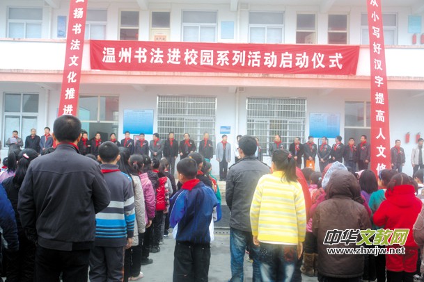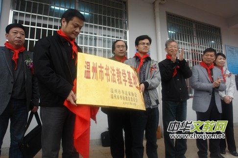 儀式上,溫州市書法家協(xié)會(huì)主席張索先生,溫州市文聯(lián)主席鄭朝陽作了熱情洋溢的講話。然后進(jìn)行了“溫州市書法教學(xué)基地”授牌、剪彩儀式。永嘉縣大岙中心小學(xué)成為首家“溫州市書法教學(xué)基地”。