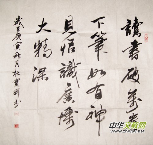 杜保剛自幼酷愛書畫,心性聰慧,高中畢業(yè)先后考入安陽師范學(xué)院和河南大學(xué)學(xué)習(xí)美術(shù)和中文。參加工作后,從事教學(xué)工作至今。不管工作有多忙,每天都要研習(xí)書法,經(jīng)過盡20多年的練習(xí),熟練的掌握了真、草、隸、篆和甲骨文等書體。各種字體都寫得氣勢(shì)磅礴,壯偉雄渾。橫眉之氣中,剛?cè)嵯酀?jì),瀟灑自如,體現(xiàn)出了豪爽向上的精神,有一種英俊飄逸之氣,拂拂筆端,表現(xiàn)出了卓爾不凡的才氣。他重墨以筆為寄托,筆以墨來表現(xiàn),濃濕、輕重,枯潤、明暗運(yùn)用的得心應(yīng)手。其行草更是騰躍有勢(shì),氣勢(shì)充沛,字與字、行與行之間疏密得當(dāng),以中鋒為主,側(cè)鋒為輔,中鋒取其渾勁,側(cè)鋒取其妙美,藏鋒以包其氣,露鋒以耀精神。行文有游龍出水、云煙飄動(dòng)的效果,具有強(qiáng)烈的節(jié)奏感和韻律美,余韻裊裊,讓人的身心都受到它的浸染、滋潤,而微微感到一種細(xì)雨濕衣似的意義,故能“持之非強(qiáng),來之無窮”。興味隱躍,由低而高,逐步上升,高湖頂點(diǎn),一覽無余,索然興盡。