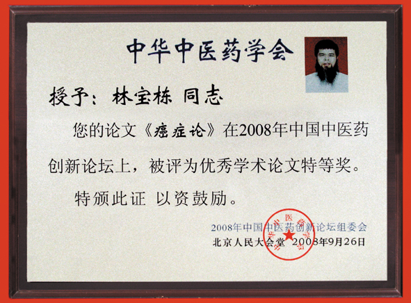 林寶棟名老中醫(yī)的學(xué)術(shù)論文《癌癥論》于2008年9月26日在人民大會堂召開的中國中醫(yī)藥創(chuàng)新論壇上被中華中醫(yī)藥學(xué)會等評為優(yōu)秀學(xué)術(shù)論文特等獎。
