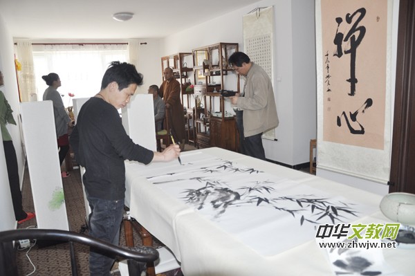 北京正念正心國(guó)學(xué)文化研究院常務(wù)院長(zhǎng)靳新國(guó)(笑琰)在交流中心為法師們寫字交流。