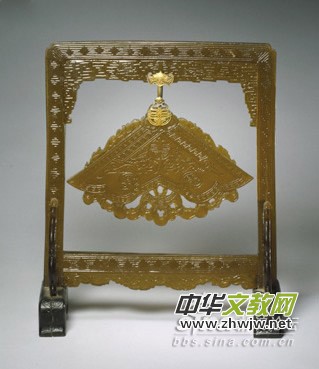 魚鰾帶架戟磬,清,高28.3cm,寬23.1cm。清宮舊藏。帶架戟磬兩件似為一對。其中一件磬體略成扇形,浮雕卐字紋帶、回紋帶為飾,下部鏤雕魚紋。魚、磬諧寓“吉慶有余”,為中國傳統(tǒng)吉祥紋飾組合形式之一。頂角有銅制變體壽字形活環(huán),與支架上的蝙蝠形掛鉤相配,組成“福壽”寓意的紋飾。支架方體,邊框飾陰刻回紋裝飾,站牙飾夔紋及回紋。另一件結(jié)構(gòu)、紋飾與前件相近,惟磬身裝飾為雙螭捧壽紋,下部鏤雕蝙蝠綬帶,亦寓“福壽”之意。