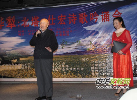 吟誦會由中國詩人俱樂部秘書長楚天舒策劃,中國詩人俱樂部朗誦團(tuán)團(tuán)長金敏潔編導(dǎo),北京大學(xué)朗誦藝術(shù)團(tuán)指導(dǎo)老師楊曉華主持。曹文娟、姬國勝、王艷和于曉鵬等朗誦家們精彩演繹了北塔和仕宏的詩作共23首。