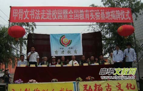 5月22日,中國(guó)傳統(tǒng)教育甲骨文進(jìn)校園暨全國(guó)教育實(shí)驗(yàn)基地揭牌儀式在河南安陽永和育才學(xué)校舉行,安陽市政協(xié)副主席喬國(guó)強(qiáng)、安陽市人民政府原副秘書長(zhǎng)、中國(guó)甲骨文書法研究會(huì)副會(huì)長(zhǎng)兼秘書長(zhǎng)劉繼賢、中國(guó)中小學(xué)文化藝術(shù)研究中心副秘書長(zhǎng)、北京寫作學(xué)會(huì)教育科學(xué)委員會(huì)秘書長(zhǎng)林臏、安陽工學(xué)院工會(huì)副主席馬德林、安陽市政協(xié)常委段寶珊、安陽市中級(jí)人民法院工會(huì)主席李廣慶、國(guó)際中國(guó)書法家協(xié)會(huì)會(huì)員、著名書法家于半丁、安陽市龍安區(qū)婦聯(lián)原主任趙美蘭、安陽縣人民政府辦公室科長(zhǎng)楚國(guó)華、安陽縣永和鄉(xiāng)書記狄永軍、安陽育才教育集團(tuán)董事長(zhǎng)馮海泉及著名書法家高向時(shí)、王崇等領(lǐng)導(dǎo)參加了揭牌儀式。
