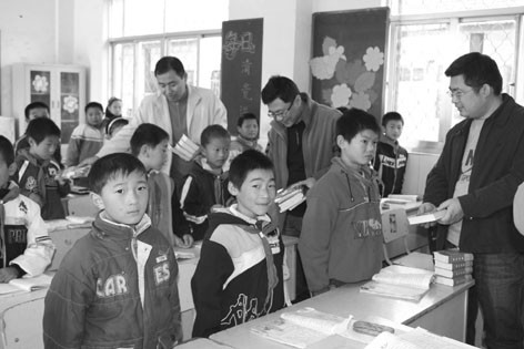 1028日上午,江蘇省灌南縣三口鎮(zhèn)中心小學(xué)喜氣盈門,連云港市黨校的江校長偕同部分學(xué)員在三口鎮(zhèn)黨委書記陶必林的陪同下,來到三口小學(xué),向該校捐贈了幾百冊圖書,并向兩名特困生分別捐助了500元錢,鼓勵他們好好學(xué)習(xí),勵志上進。(馬巧云  崔 杰)