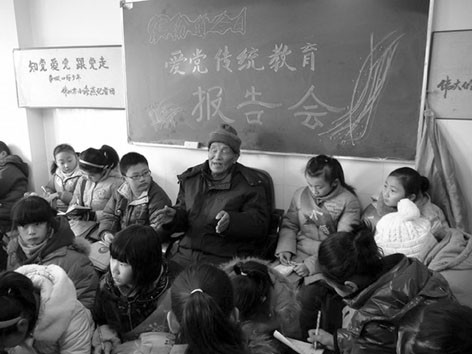 為紀(jì)念建黨90周年,寒假期間,江蘇省徐州市小海燕記者團(tuán)開展了繽紛的冬日采訪活動(dòng),他們深入社區(qū),走進(jìn)家庭采訪老黨員、老干部、老戰(zhàn)士,慰問烈軍屬孤寡老人,過一個(gè)有意義的寒假。圖為江蘇省勞動(dòng)模范、老黨員、老干部朱繼松爺爺向小海燕記者團(tuán)的小記者講黨的傳統(tǒng)教育,讓小記者深受感動(dòng)。