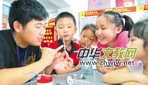 大學(xué)生在為孩子們“解剖”小水泵模型