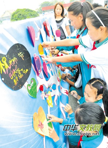 近日,山東省桓臺縣索鎮(zhèn)中心小學的少先隊員把對教師節(jié)的節(jié)日問候和美好祝福寫在紙片上,制作成心愿卡,掛在 “愛心樹”的樹上,表達對教師節(jié)美好祝愿和感恩之情。圖為該校少先隊員在“愛心樹”上掛愛心卡時的情景。