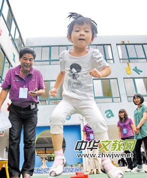 江蘇省鎮(zhèn)江市是該省國民體質(zhì)監(jiān)測點。近期,有關部門開始對該市城鎮(zhèn)幼兒開展體質(zhì)監(jiān)測,通過14個項目的綜合測試,統(tǒng)計出準確的健康狀況數(shù)據(jù),幫助制定科學健身方法。圖為專業(yè)人員在對小朋友進行連續(xù)跳測試。 (陳崗 攝)