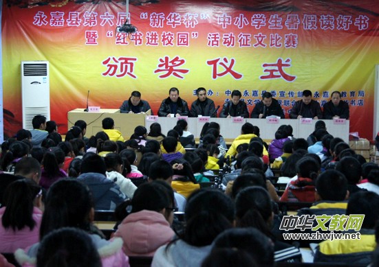 頒獎儀式中,永嘉縣委宣傳部副部長谷鐵榮同志發(fā)表了重要講話。他認為“新華杯”中小學生暑假讀好書暨“紅書進校園”讀書征文活動,是創(chuàng)建書香校園的有效途徑,是加強未成年人思想道德建設(shè),激發(fā)學生深入了解社會主義核心價值的新舉措,也是推動永嘉文化大縣建設(shè)、創(chuàng)建永嘉精神家園的載體之一。谷副部長強調(diào),今后要繼續(xù)深入開展讀好書活動,在日常生活、學習中,要讓永嘉學子有書讀、愛讀書、會讀書、讀好書。