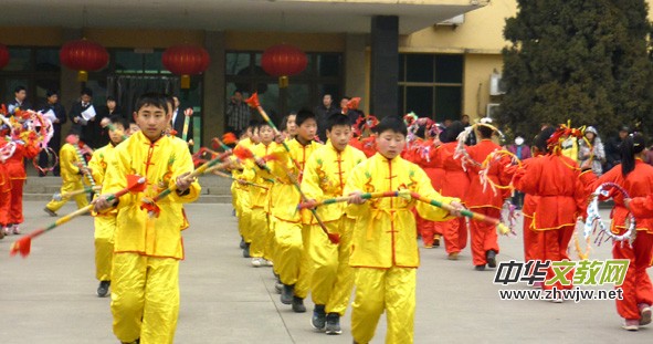 本報(bào)訊 為迎接新春元宵佳節(jié)的到來,給45萬陽信人民帶來吉祥和諧的快樂氣氛,2月5日,全國著名的亞梨之鄉(xiāng)山東省陽信縣,一年一度的元宵表演盛會(huì)在梨園廣場(chǎng)隆重舉行,來自全縣6個(gè)鄉(xiāng)鎮(zhèn)表演了各自精彩的拿手節(jié)目。最顯眼的是在北京2008年世界第29屆奧運(yùn)會(huì)上,展現(xiàn)在世人面前的打花棍翻花環(huán)節(jié)目,也來到了梨園廣場(chǎng),他們是由60余名師生組成的陽信縣流坡塢鎮(zhèn)代表隊(duì)。(圖為:山東省陽信縣流坡塢鎮(zhèn)二陳小學(xué)代表鎮(zhèn)政府在縣府表演打花棍翻花環(huán)。)
