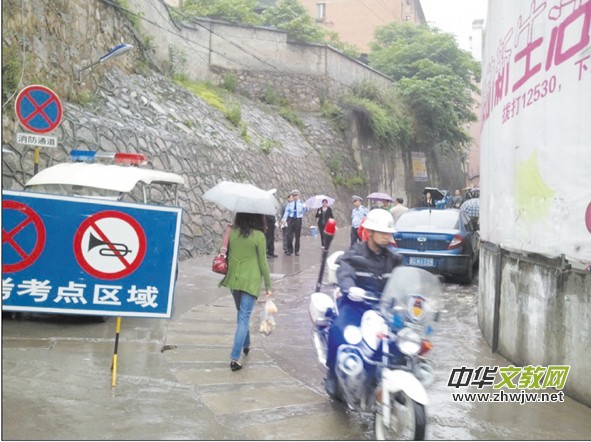 本報(bào)訊:(本報(bào)駐黔記者:張林)2012年高考第一天,位于貴州省遵義市五中考點(diǎn)外的民警冒雨堅(jiān)守崗位。因下雨導(dǎo)致部分考生未能及時(shí)打車到考場(chǎng),民警動(dòng)用警車接考生,圖為遵義民警出動(dòng)警用摩托車去接考生。