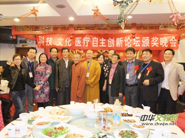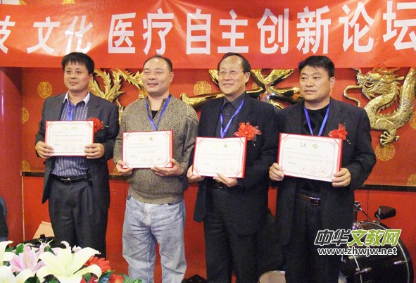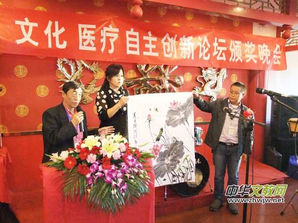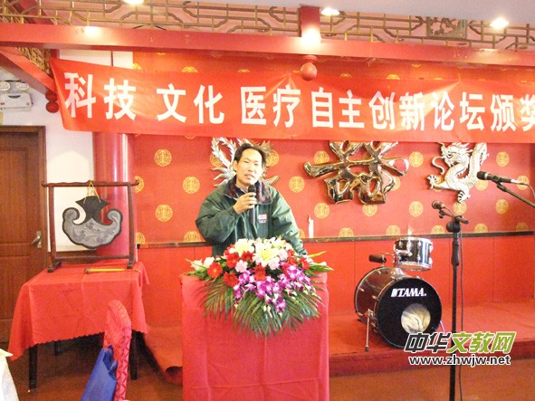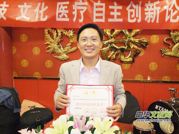 北京福禱平安酒業(yè)有限公司開發(fā)的“大度尊酒”榮獲科技創(chuàng)新金獎,圖為該公司總經(jīng)理趙友秀在領(lǐng)獎臺上