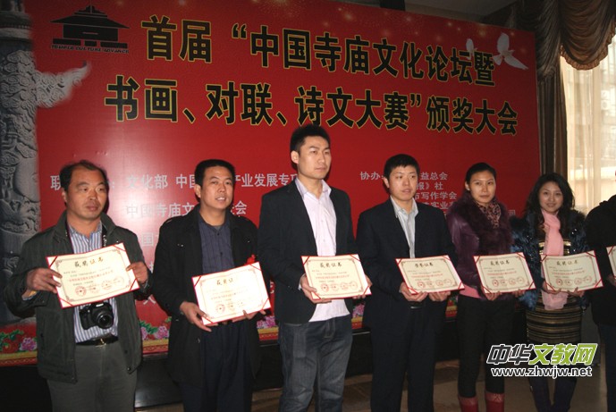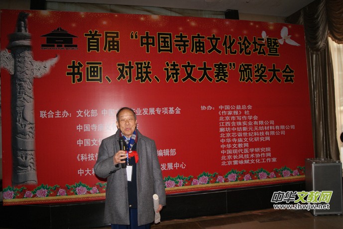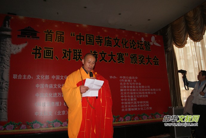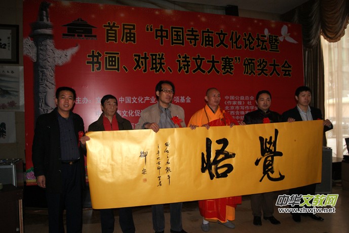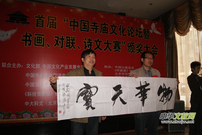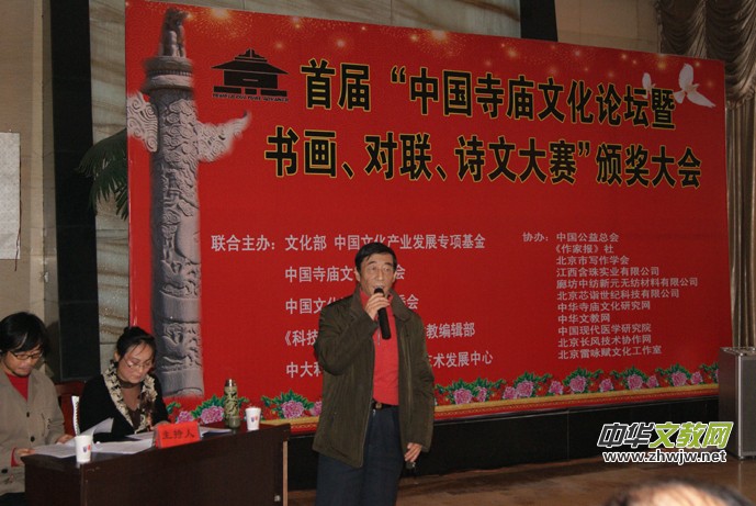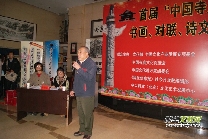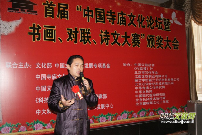 中國(guó)寺廟文化促進(jìn)會(huì)會(huì)長(zhǎng)靳新國(guó)說:“改革開放以來,修廟建寺之風(fēng)如雨后春筍在神州大地再次盛行。一座寺廟,有沒有歷史,有沒有文化內(nèi)涵,表志這個(gè)寺廟的品位與質(zhì)量,自古以來好的名勝景區(qū)多有文人墨客佳作傳世,寺廟為我們留下了不少寶貴的文化遺產(chǎn),特別是在雕塑造像、詩文對(duì)聯(lián)、書畫、建筑、石刻、素食餐飲文化、服飾文化、祈禱文化、、規(guī)勸文化等等方面影響深遠(yuǎn)。為給新中國(guó)的寺廟文化藝術(shù)注入我們這個(gè)時(shí)代的精典藝術(shù)是我們這代人的使命,如何讓書畫、對(duì)聯(lián)、詩文與佛教、道教多元結(jié)合,意義遠(yuǎn)大,將是人類的又一批寶貴財(cái)富。中國(guó)寺廟文化促進(jìn)會(huì)組織為此組織此次活動(dòng),主要目的就是想在全國(guó)團(tuán)結(jié)一批能人志士,為當(dāng)今寺廟文化注入新的內(nèi)涵。此次大賽征稿工作于2012年10月10日結(jié)束,收到上千件參賽作品,經(jīng)過初評(píng)、復(fù)評(píng)、終評(píng),評(píng)出書畫獲獎(jiǎng)作品168件,對(duì)聯(lián)56幅,詩文50篇。此次的書畫展共展出200件作品。”