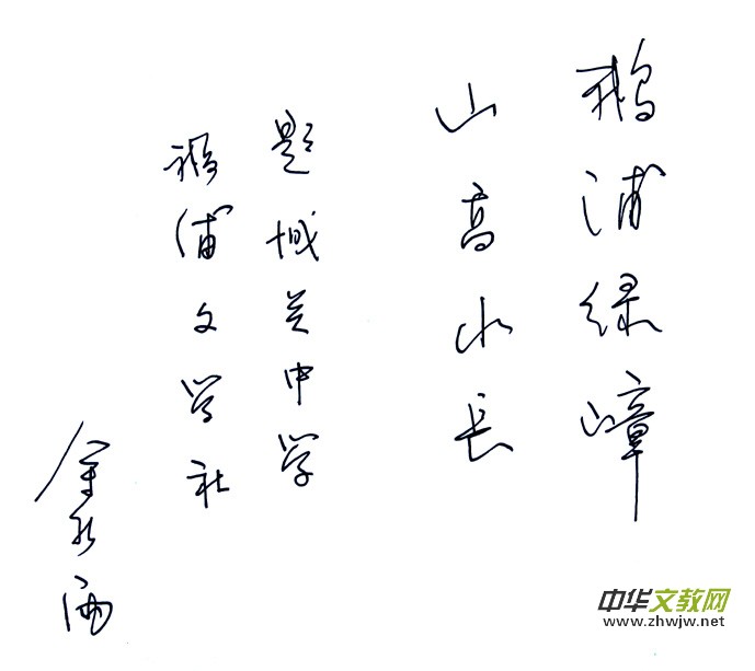 5月28日,著名文化史學(xué)者、文學(xué)家、散文家、作家、藝術(shù)理論家余秋雨大師應(yīng)邀為浙江省永嘉縣委、縣政府主辦的“楠溪講壇”永嘉文化講座。并于5月27日下午,在中國藝術(shù)研究院展覽演出中心副主任盧俊舟、縣委宣傳部常務(wù)副部長谷胡方、副部長谷鐵榮等有關(guān)單位人員的陪同下,坐竹筏漂流楠溪江,領(lǐng)略美麗的山光水色;走訪麗水長廊,感知古村落的魅力文化。《溫州都市報》、永嘉電視臺和《今日永嘉》記者跟蹤采訪,本報記者、《美文》雜志特邀編輯、永嘉縣城關(guān)中學(xué)鵝浦文學(xué)社指導(dǎo)師谷福林隨行采訪,并十年后再次與余秋雨大師合影。上圖是余秋雨為城關(guān)中學(xué)鵝浦文學(xué)社題詞。