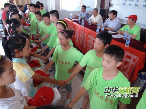 本報(bào)訊 8月11日,徐州市小海燕記者團(tuán)百名小記者冒著38度高溫,乘車來到離徐州一百多公里的新沂馬陵山革命老區(qū),與這里的20余名留守兒童手拉手、交朋友、結(jié)對(duì)子,小海燕記者團(tuán)向留守兒童贈(zèng)送服裝、帽子、報(bào)紙、采訪筆等,小記者與留守兒童手拉手,相互記下通訊地址、聯(lián)系電話,互贈(zèng)禮品交流感情,相互囑咐。在活動(dòng)現(xiàn)場(chǎng)城鄉(xiāng)兒童與75歲的徐建華老教師一起共話這個(gè)夢(mèng)。而后小記者與留守兒童同臺(tái)聯(lián)歡,歌舞、合唱、獨(dú)奏把活動(dòng)推向高潮,大家沉浸在一片快樂的氣氛中,一位留守兒童高興地說,這是我人生最有意義的一天,讓我終生難忘。圖為小海燕記者團(tuán)與留守兒童手拉手交朋友。