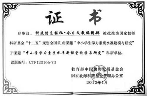 經(jīng)教育部中國教師發(fā)展基金會(huì)、國家教師科研專項(xiàng)基金管理辦公室批準(zhǔn),《科技信息報(bào)·今日文教》編輯部被指定為國家教師科研“十二五”規(guī)劃重點(diǎn)課題《中小學(xué)生學(xué)力素質(zhì)水準(zhǔn)建模與研究》總課題和子課題《中小學(xué)學(xué)力素質(zhì)水準(zhǔn)新課堂教學(xué)與研究》的組織研究者和課題科研單位,并被總課題組授權(quán)為其總課題組學(xué)術(shù)研究平臺(tái),本報(bào)主編靳新國和編輯部主任王紅研為總課題專家組成員、主編靳新國并被任命為工作組組長。經(jīng)決定,二零一三年在全國發(fā)展國家教師科研專項(xiàng)基金十二五”規(guī)劃重點(diǎn)課題《中小學(xué)生學(xué)力素質(zhì)水準(zhǔn)建模與研究》子課題、實(shí)驗(yàn)區(qū)校,和編輯部承擔(dān)的子課題《中小學(xué)學(xué)力素質(zhì)水準(zhǔn)新課堂教學(xué)與研究》課題實(shí)驗(yàn)校、研究員為首要工作,同時(shí)開展“全國優(yōu)秀校長、班主任、教師”的推薦評(píng)選、和“全國優(yōu)秀教師論文”、“全國教師教育科研錄像優(yōu)質(zhì)課、課件、教案評(píng)選”活動(dòng)等。具體申報(bào)《中小學(xué)學(xué)力素質(zhì)水準(zhǔn)新課堂教學(xué)與研究》課題實(shí)驗(yàn)校、或研究員條件及要求、服務(wù)如下: