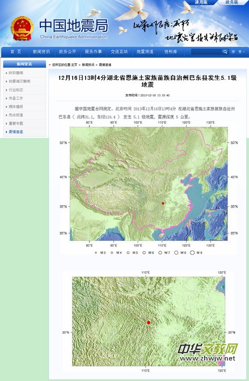 人民網(wǎng)北京12月16日電 (唐嘉藝)據(jù)中國地震局網(wǎng)消息,中國地震臺網(wǎng)測定,北京時間2013年12月16日13時4分在湖北省恩施土家族苗族自治州巴東縣(北緯31.1,東經(jīng)110.4)發(fā)生5.1級地震, 震源深度5公里。