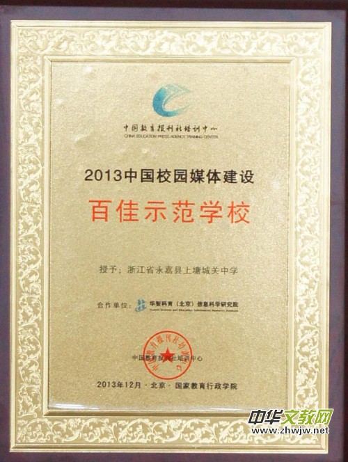 該活動由中國教育報刊社培訓(xùn)中心主辦,華智科育(北京)信息科學(xué)研究院協(xié)辦,人民網(wǎng)、新華網(wǎng)、中國教育新聞網(wǎng)、中國教育在線、華科網(wǎng)《中國教育報》、《人民教育》、《現(xiàn)代教育報》等八家媒體支持。該評選活動分小組、中學(xué)、中職三個組進行,旨在推進素質(zhì)教育,展示特色學(xué)校校園媒體建設(shè)方面的成果,交流校園媒體建設(shè)的經(jīng)驗。活動自2012年12月啟動以來,全國各地共有2000多所學(xué)校報名參評。通過申報校園媒體建設(shè)成果材料、初評、終評等階段,浙江永嘉縣城關(guān)中學(xué)從全國眾多名校中脫穎而出,被評選委員會評為“2013中國校園媒體建設(shè)百佳示范學(xué)校”。